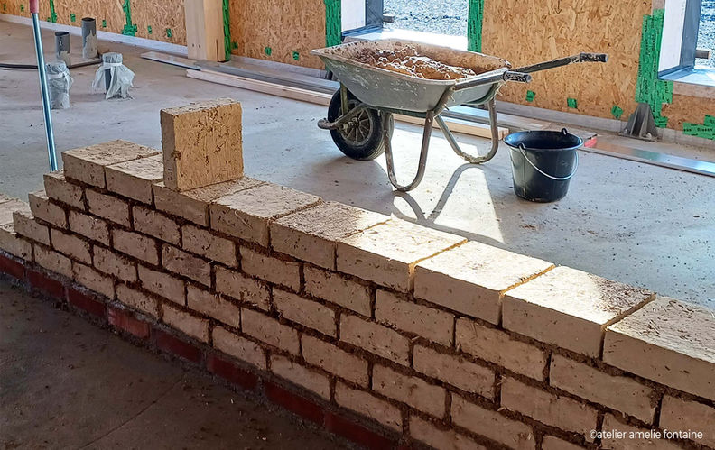 –Fabrication des 3 500 briques de terres crues (adobes) avec la terre de site sous la direction des architectes