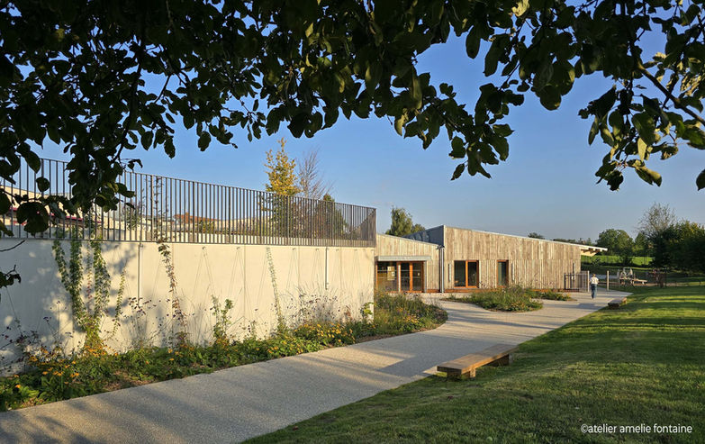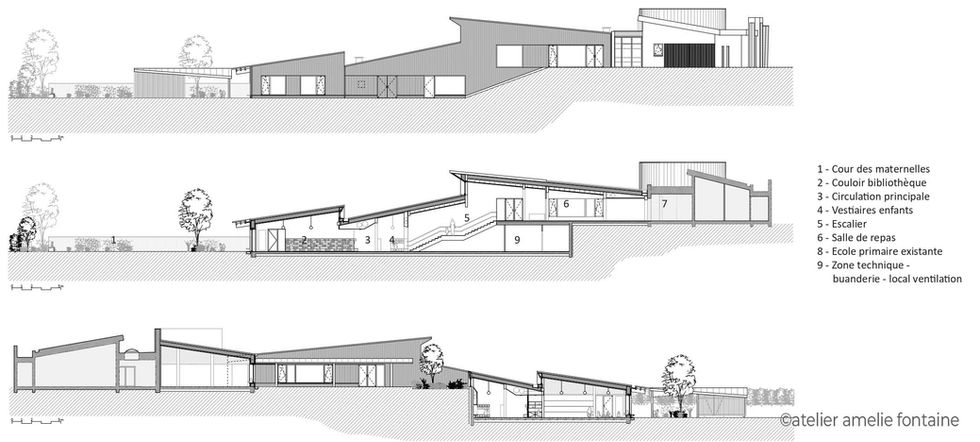 La construction s’installe dans la pente. La nouvelle école est située un niveau plus bas que l’école existante, venant constituer un niveau de rez-de-chaussée bas. Cette disposition permet de conserver la vue sur le paysage depuis l’école élémentaire.