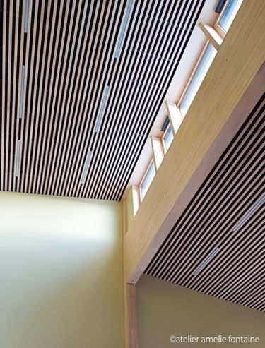 La coupe de l’école est composée afin de garantir des flux d’air (sur-ventilation nocturne notamment) et de permettre un éclairage continu de tous les espaces d’enseignement et de circulation. L’autonomie lumineuse est un atout pour l’économie d’énergie. L’ensemble est construit en peuplier / paille et Terre crue.
