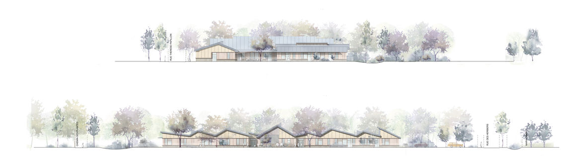 Les deux pavillons sont couverts d'une toiture en zinc qui flotte et se déplie selon les besoins : elle exprime clairement par où entrent et sortent l'air et la lumière.